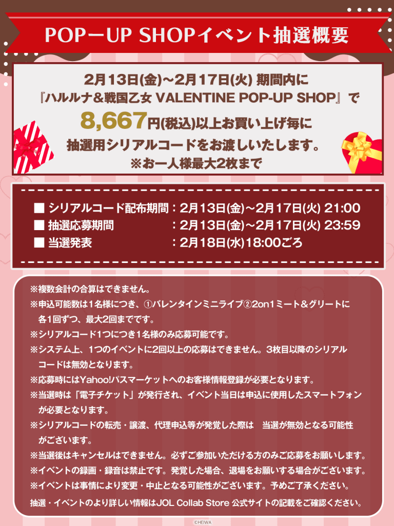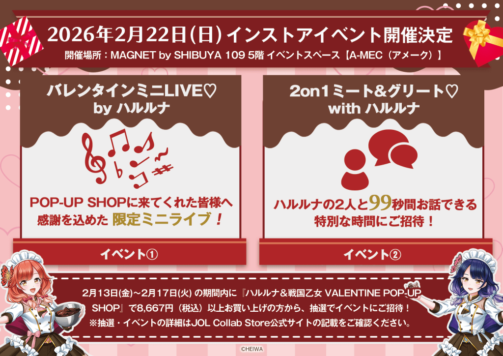 2月13日(金)~2月17日(火) の期間内に『ハルルナ&戦国乙女 VALENTINE POP-UP SHOP』で8,667円(税込)以上お買い上げの方から、抽選で特別イベントにご招待!
