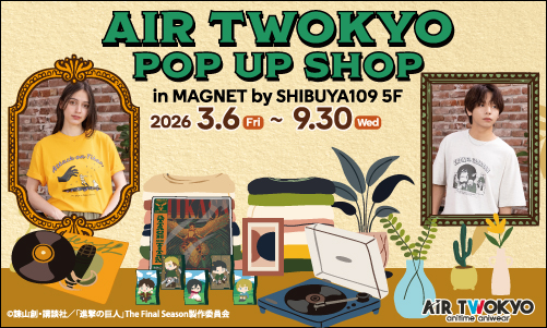 2026/03/01 "AIR TWOKYO" POP UP STORE in MAGNET by SHIBUYA109 “AIR TWOKYO” POP UP STORE in MAGNET by SHIBUYA109 3/6 オープン! 既存のアニメグッズと一線を画す独自のグラフィックデザインを起点とし、アニメ、マンガ、音楽などのポップカルチャーコンテンツの再構築を目指すファッションブランド。